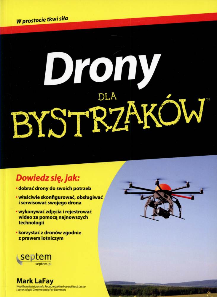 Na okładce: "W prostocie tkwi siła" ; "Dowiedz się, jak: dobrać drony do swoich potrzeb, właściwie skonfigurować, obsługiwać i serwisować swojego drona, wykonywać zdjęcia i rejestrować wideo za pomocą najnowszych technologii, korzystać z dronów zgodnie z prawem lotniczym".